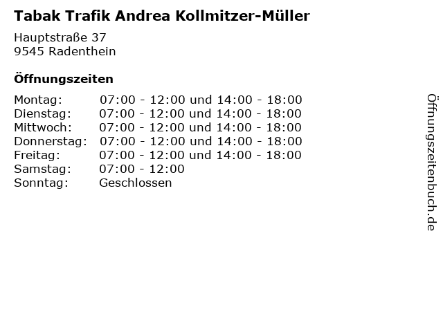 | Öffnungszeiten Tabak Trafik Andrea Kollmitzer-Müller in Radenthein anzeigen | |