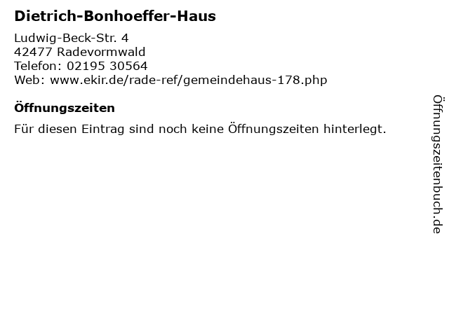 | Öffnungszeiten Dietrich-Bonhoeffer-Haus in Radevormwald anzeigen | |