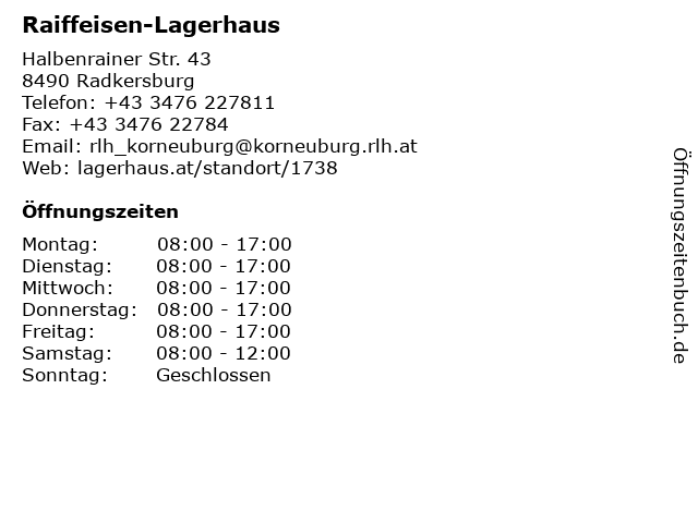 | Öffnungszeiten Raiffeisen-Lagerhaus in Radkersburg anzeigen | |