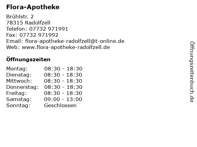 | Öffnungszeiten Flora-Apotheke in Radolfzell anzeigen | |