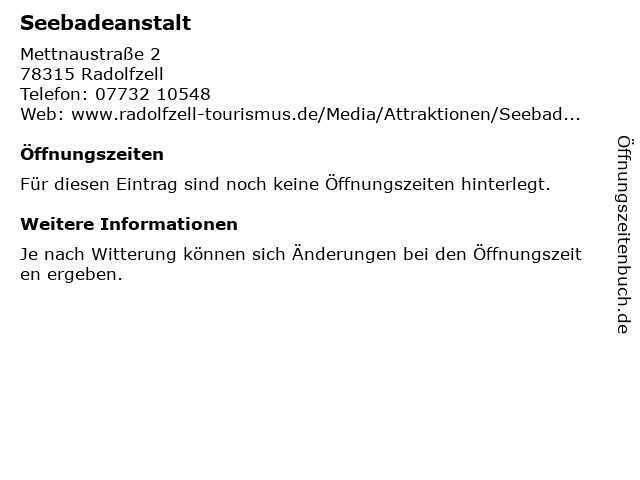 | Öffnungszeiten Seebadeanstalt in Radolfzell anzeigen | |
