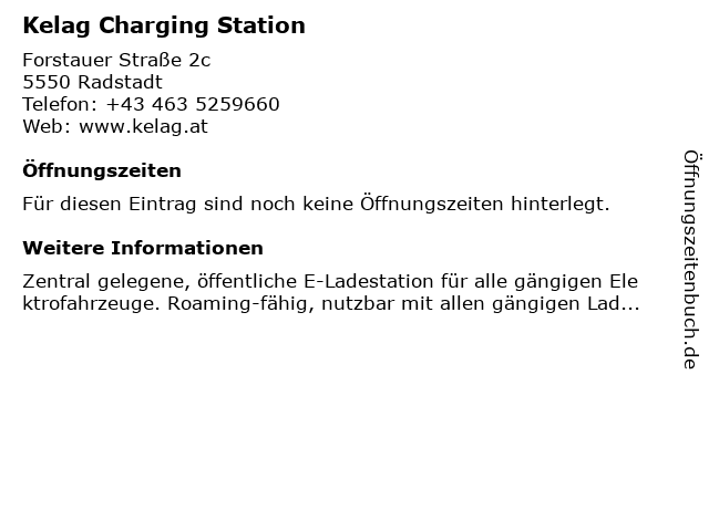 | Öffnungszeiten Kelag Charging Station in Radstadt anzeigen | |