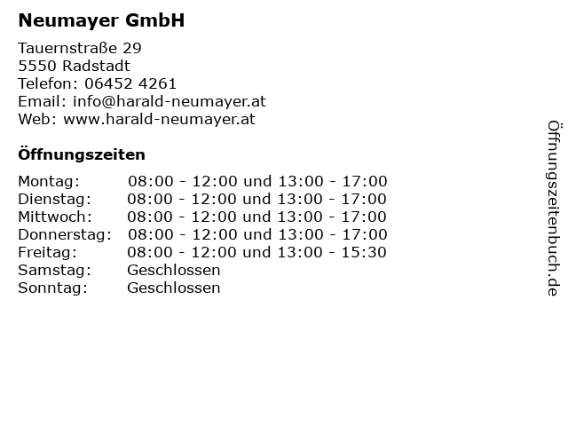 | Öffnungszeiten Neumayer GmbH in Radstadt anzeigen | |