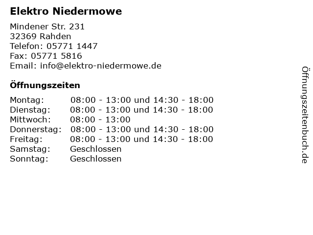 | Öffnungszeiten Elektro Niedermowe in Rahden anzeigen | |