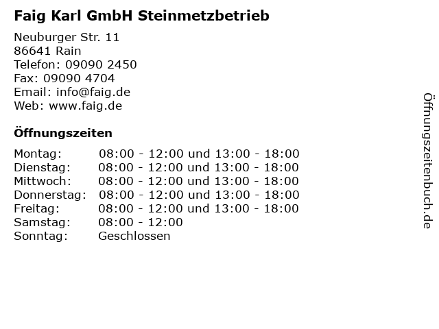 | Öffnungszeiten Faig Karl GmbH Steinmetzbetrieb in Rain anzeigen | |