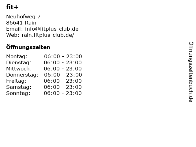 | Öffnungszeiten fit+ in Rain anzeigen | |