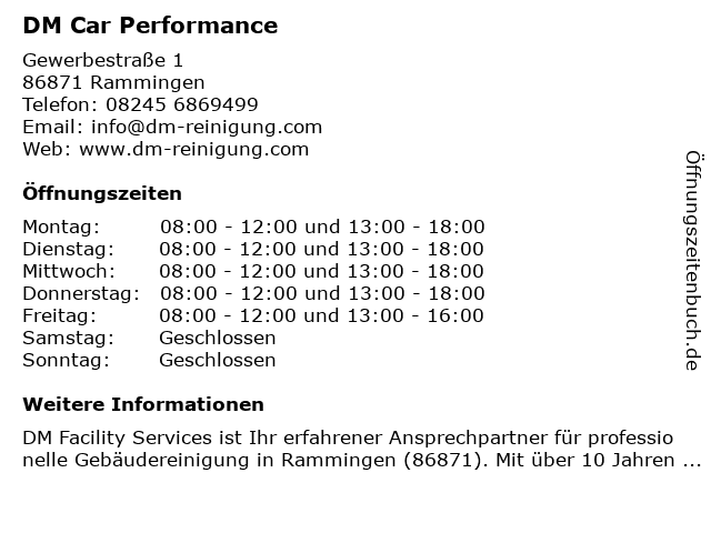 | Öffnungszeiten DM Car Performance in Rammingen anzeigen | |