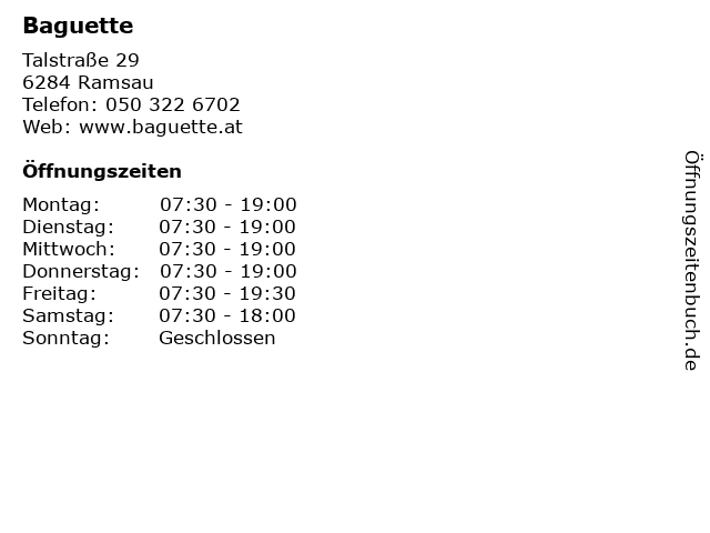 | Öffnungszeiten Baguette in Ramsau anzeigen | |