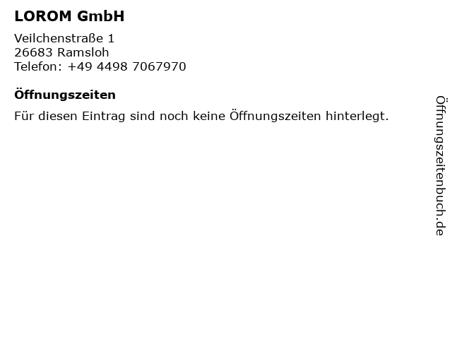 | Öffnungszeiten LOROM GmbH in Ramsloh anzeigen | |
