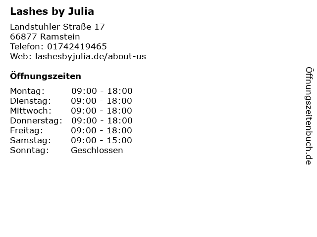 | Öffnungszeiten Lashes by Julia in Ramstein anzeigen | |
