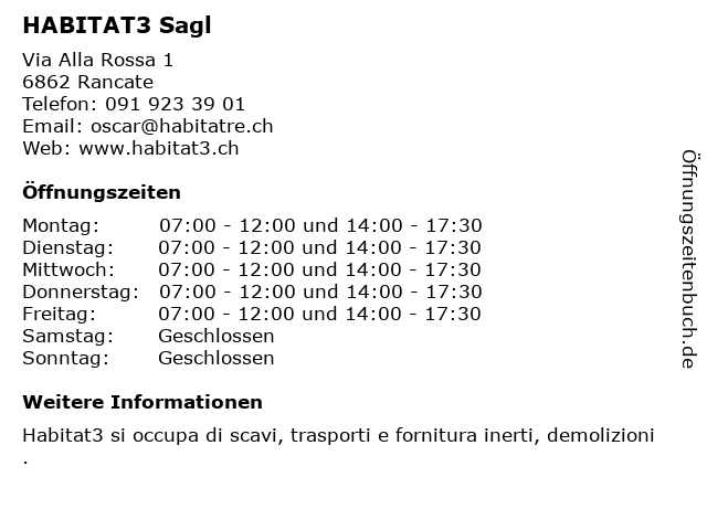 | Öffnungszeiten HABITAT3 Sagl in Rancate anzeigen | |