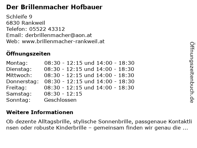 | Öffnungszeiten Der Brillenmacher Hofbauer in Rankweil anzeigen | |