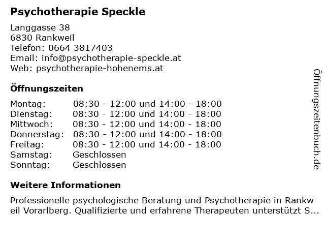 | Öffnungszeiten Psychotherapie Speckle in Rankweil anzeigen | |