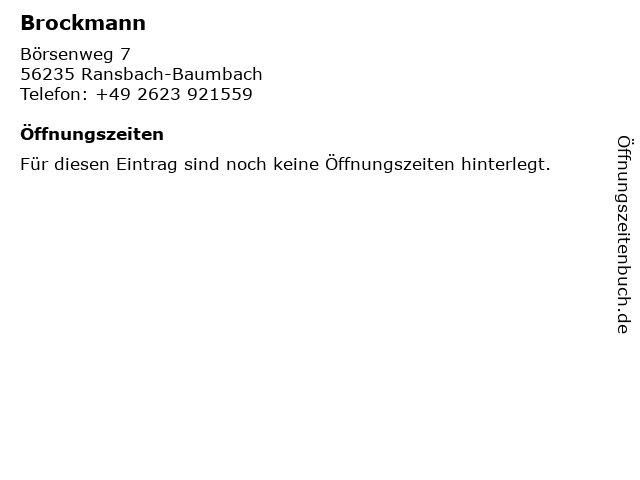 | Öffnungszeiten Brockmann in Ransbach-Baumbach anzeigen | |