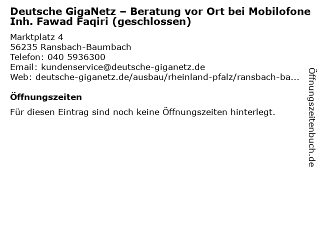 | Deutsche GigaNetz – Beratung vor Ort bei Mobilofone Inh. Fawad Faqiri (geschlossen) anrufen | |
