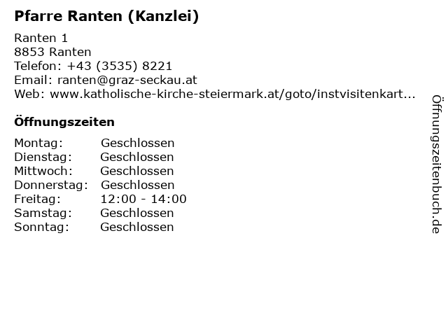 | Öffnungszeiten Pfarre Ranten (Kanzlei) in Ranten anzeigen | |