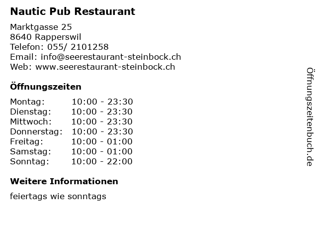 | Öffnungszeiten Nautic Pub Restaurant in Rapperswil anzeigen | |