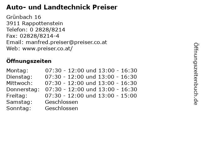 1 ad Auto Dienst - Franz Preiser e.U. - Kfz-Werkstätte (Entfernung: 10,19 km) Weitraer Strasse 8b, 3920 Groß Gerungs 4 Raiffeisen-Lagerhaus Zwettl eGen - Ersatzteile, Werkstätte Landmaschinen und Werkstätte PKW (Entfernung: 8,88 km) Grafenschlag 89, 3912 Grafenschlag 5 Raiffeisen-Lagerhaus Zwettl eGen - Ersatzteile und Werkstätte Landmaschinen/PKW (Entfernung: 12,89 km) Waldhausen 79, 3914 Waldhausen 6 Raiffeisen-Lagerhaus Zwettl eGen - Werkstätte Landmaschinen/PKW (Entfernung: 16,07 km) Sportplatzstraße 2, 3931 Schweiggers |