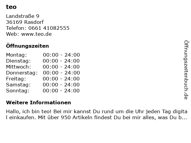 | Öffnungszeiten teo in Rasdorf anzeigen | |