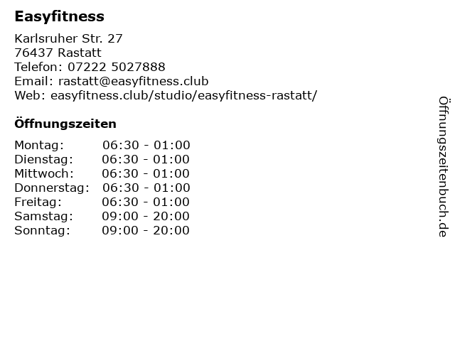 | Öffnungszeiten Easyfitness in Rastatt anzeigen | |