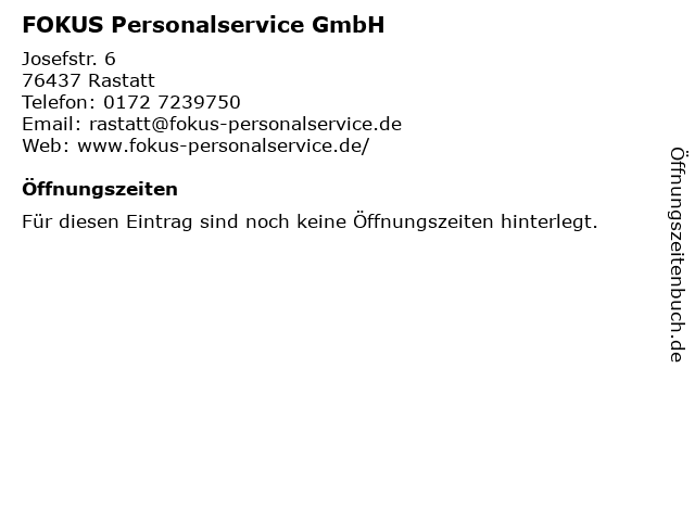 | Öffnungszeiten FOKUS Personalservice GmbH in Rastatt anzeigen | |