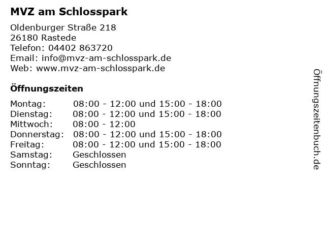 | Öffnungszeiten MVZ am Schlosspark in Rastede anzeigen | |