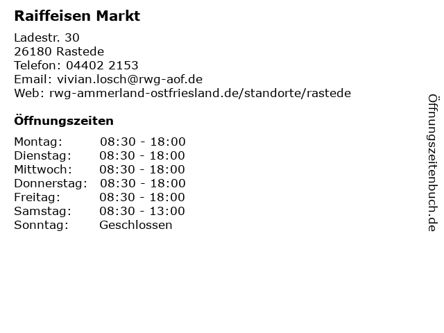 | Öffnungszeiten Raiffeisen Markt in Rastede anzeigen | |