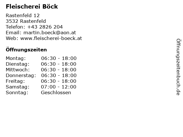 | Öffnungszeiten Fleischerei Böck in Rastenfeld anzeigen | |