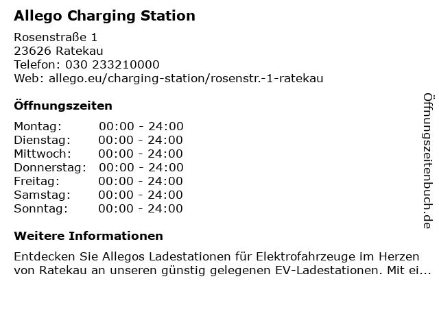 | Öffnungszeiten Allego Charging Station in Ratekau anzeigen | |