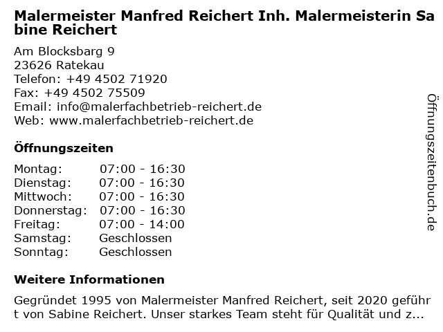 Öffnungszeiten Malermeister Manfred Reichert Inh. Malermeisterin Sabine Reichert