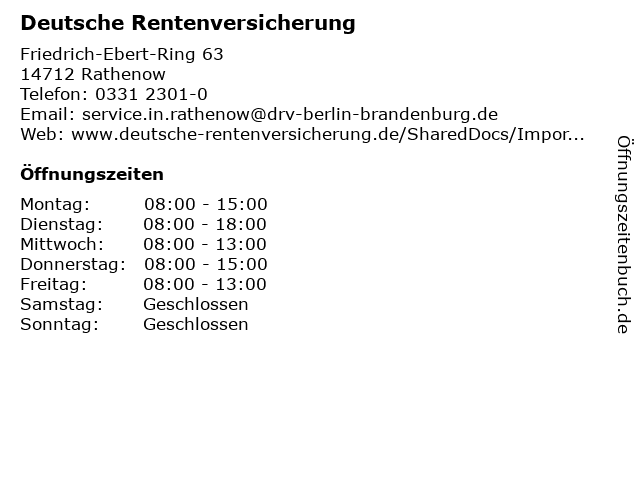| Öffnungszeiten Deutsche Rentenversicherung in Rathenow anzeigen | |