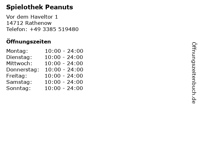 | Öffnungszeiten Spielothek Peanuts in Rathenow anzeigen | |