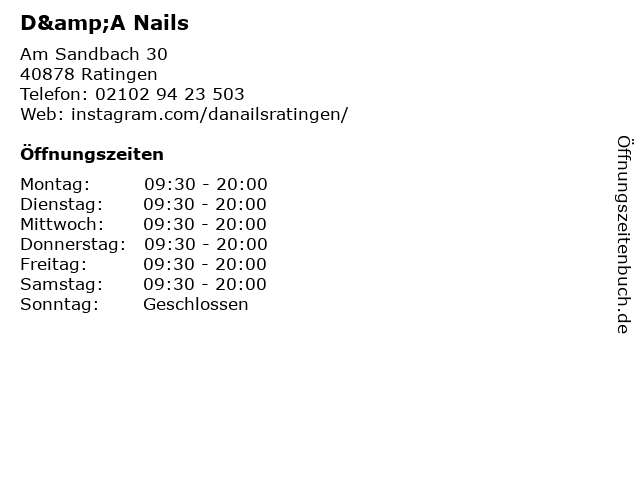 | Öffnungszeiten D&A Nails in Ratingen anzeigen | |