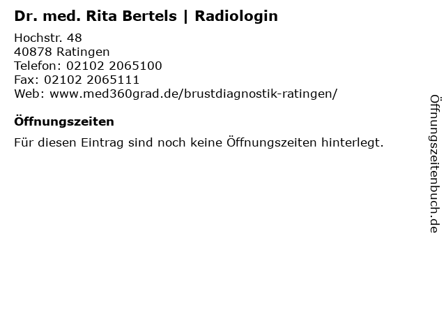 2 Rita Bertels Fachärztin für Radiologische Diagnostik (Entfernung: 0,34 km) Mülheimer Str. 12, 40878 Ratingen 3 Heinz Brazda Paten indischer Kinder e.V., Rita (Entfernung: 2,79 km) Breslauer Str. 47, 40880 Ratingen 6 |