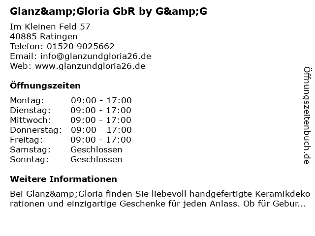 | Öffnungszeiten Glanz&Gloria GbR by G&G in Ratingen anzeigen | |