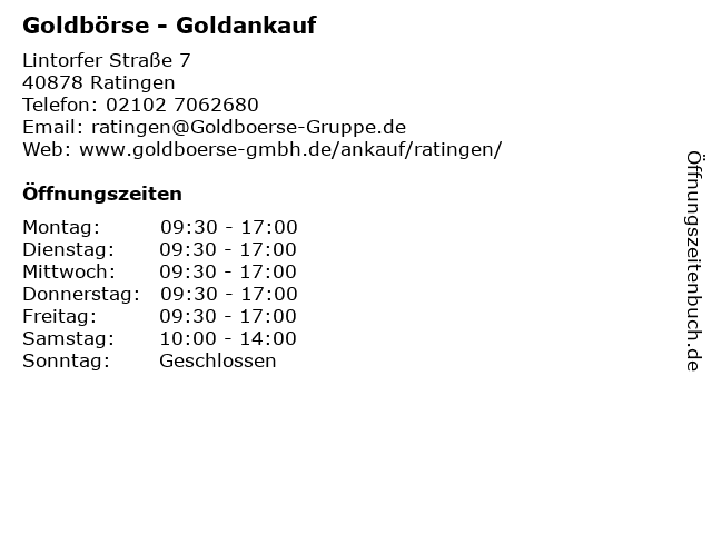 | Öffnungszeiten Goldbörse - Goldankauf in Ratingen anzeigen | |