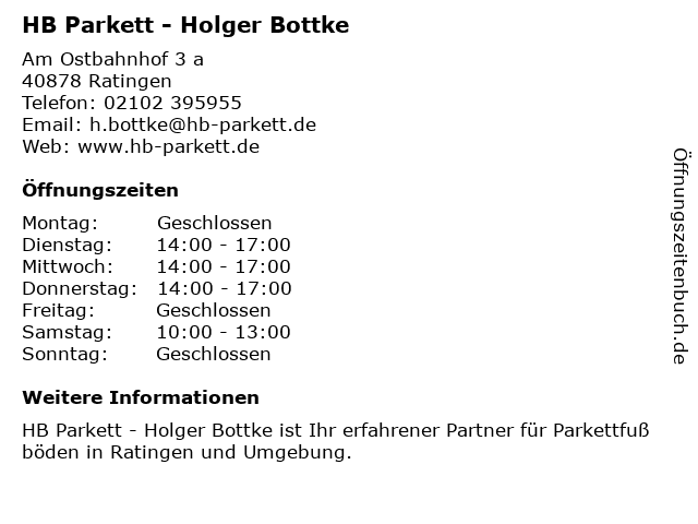 | Öffnungszeiten HB Parkett - Holger Bottke in Ratingen anzeigen | |