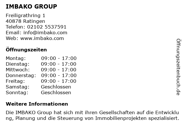 Öffnungszeiten IMBAKO GROUP in Ratingen anzeigen | |