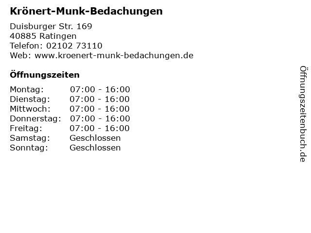 | Öffnungszeiten Krönert-Munk-Bedachungen in Ratingen anzeigen | |
