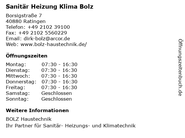 | Öffnungszeiten Sanitär Heizung Klima Bolz in Ratingen anzeigen | |