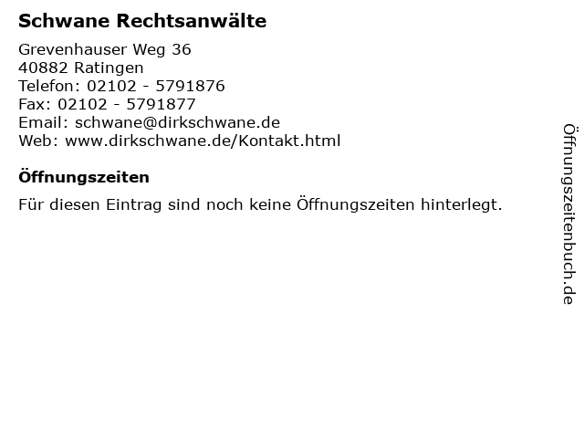| Öffnungszeiten Schwane Rechtsanwälte in Ratingen anzeigen | |