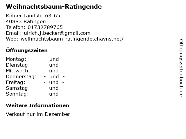 | Öffnungszeiten Weihnachtsbaum-Ratingende in Ratingen anzeigen | |
