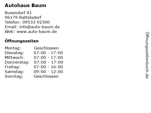 | Öffnungszeiten Autohaus Baum in Rattelsdorf anzeigen | |