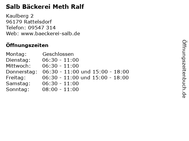 | Öffnungszeiten Salb Bäckerei Meth Ralf in Rattelsdorf anzeigen | |