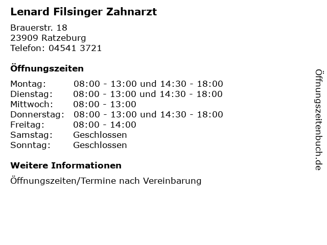 | Öffnungszeiten Lenard Filsinger Zahnarzt in Ratzeburg anzeigen | |