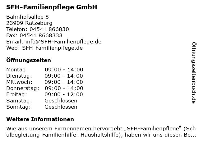 | Öffnungszeiten SFH-Familienpflege GmbH in Ratzeburg anzeigen | |