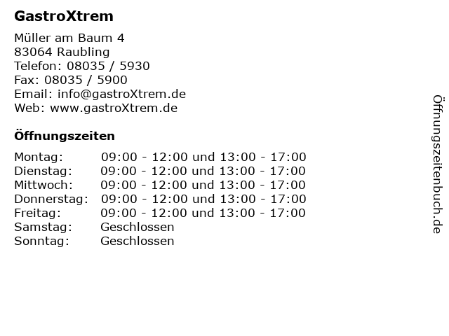 | Öffnungszeiten GastroXtrem in Raubling anzeigen | |