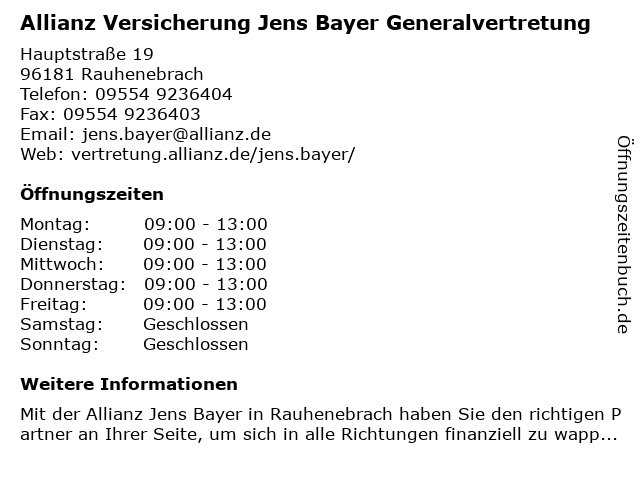 3 Allianz Versicherung Thomas Stadelmann Generalvertretung (Entfernung: 10,75 km) Hauptstraße 28, 97516 Oberschwarzach 4 Allianz Versicherung Fuchs OHG Generalvertretung (Entfernung: 11,08 km) Zum Alten Grund 31, 97522 Sand am Main 5 Allianz Versicherung Volkmar Schmal Generalvertretung (Entfernung: 12,70 km) Steinsdorfer Hauptstraße 3, 96185 Schönbrunn im Steigerwald 6 |