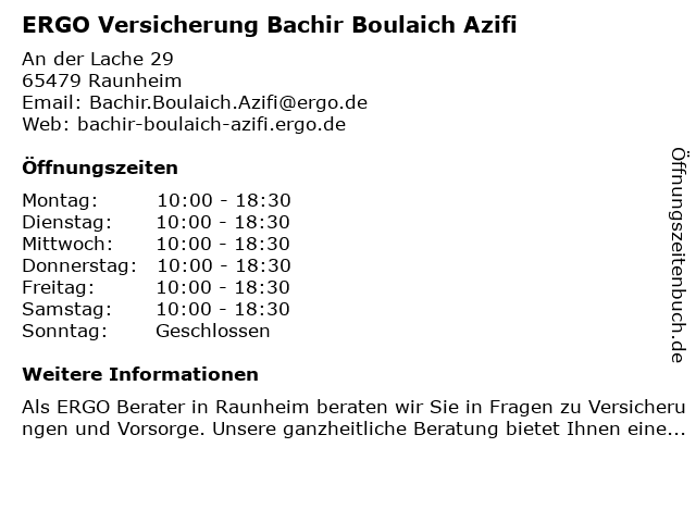 | Öffnungszeiten ERGO Versicherung Bachir Boulaich Azifi in Raunheim anzeigen | |