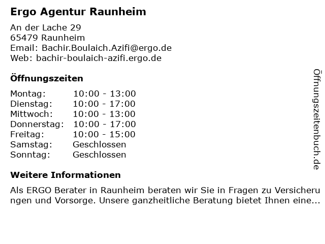 | Öffnungszeiten Ergo Agentur Raunheim in Raunheim anzeigen | |